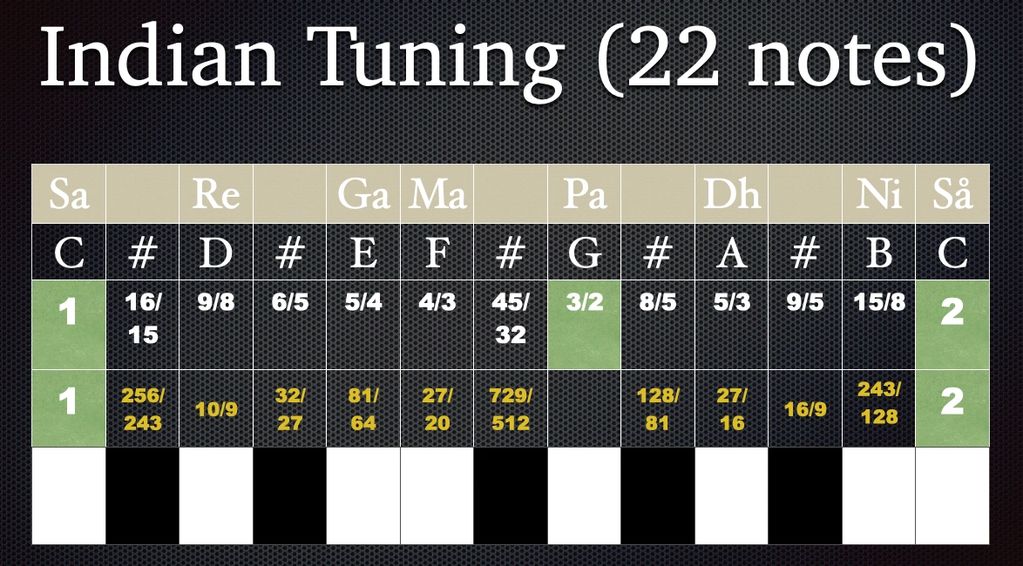 The Indian system uses 5-limit JI system with 10 alternate derivations of all 12 notes except C&G, using higher powers of 2,3 and 5